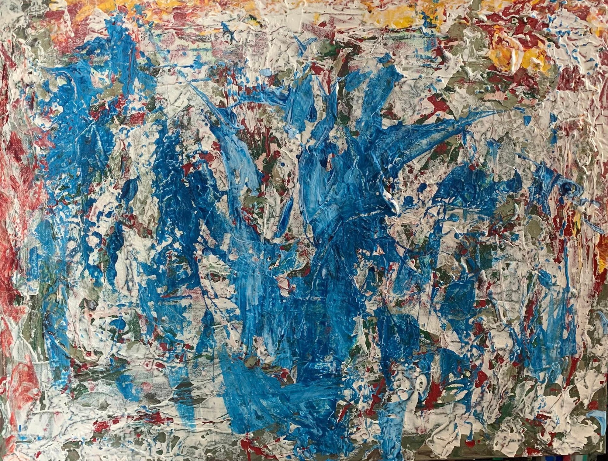 Acrylics on 18 x 24 inch stretched canvas, this painting is titled "Breakthrough in Blue". Completed in 2025, this original acrylic work spent time in a local gallery. As with many abstract creations, the viewer may see images not recognized by the artist. I do not ship outside the US.